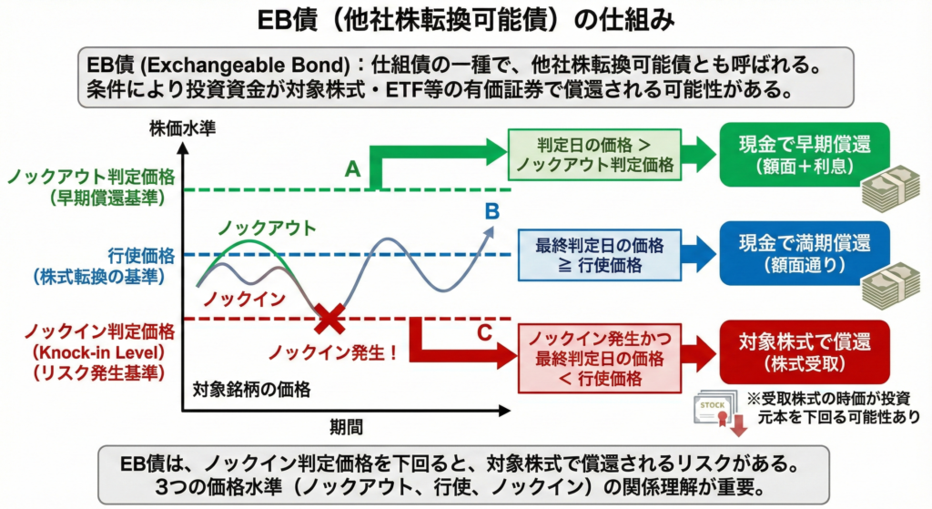 EB債について詳しく知りたい方は「EB債(他社株転換可能債)とは?リスクや発行体のメリット、ノックインなどの仕組みをわかりやすく解説!」もぜひ参考にしてください。