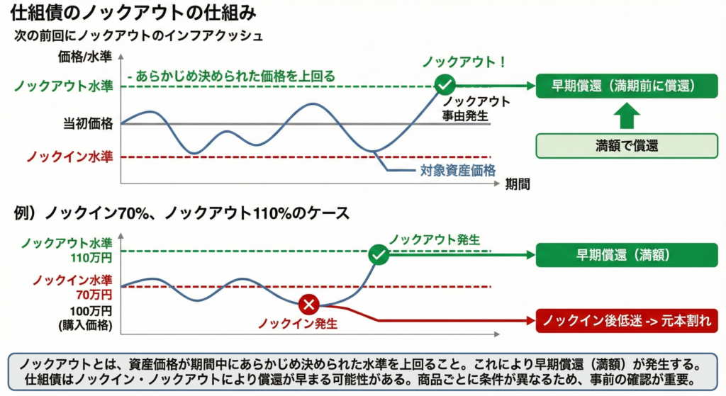 逆に、あらかじめ決められた価格(水準)を上回ることを「ノックアウト」と言います。ノックアウトになると、早期償還(満期前に償還)が発生します。