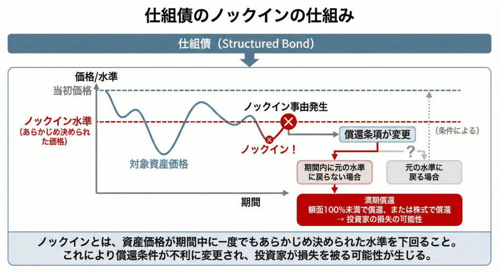 具体的にはノックインした後、期間内に元の水準に戻らないと、額面100%で満期償還されなかったり、株式で償還されたりするケースがあります。