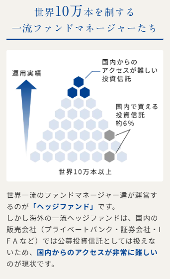 当社では純金融資産1億円以上のお客様を中心に、国内金融機関ではご投資が難しい、世界有数の海外一流ヘッジファンドへの直接投資を助言しております。